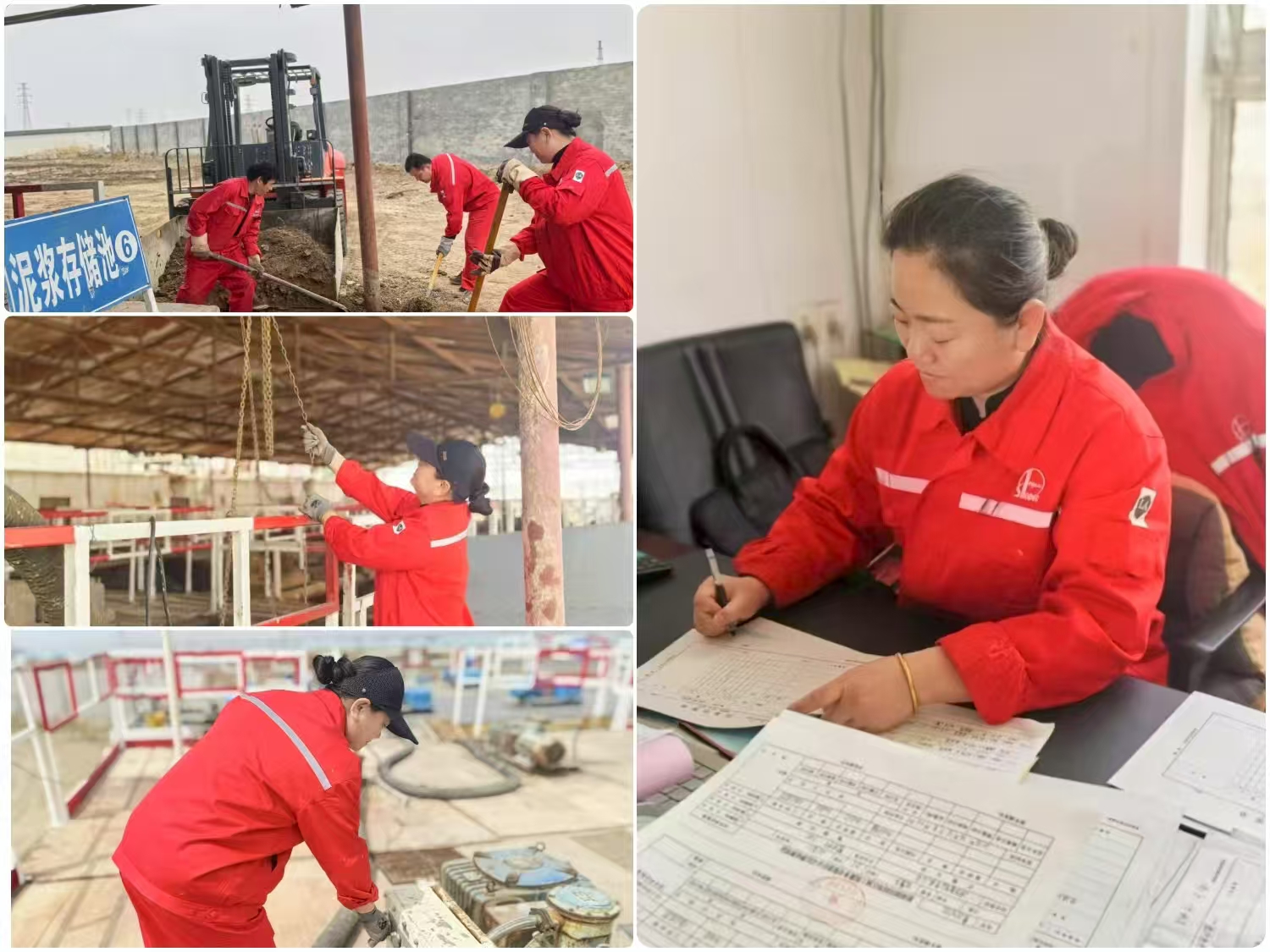 9月初,在后勤保障工作期间,3号泥浆罐突然出现状况:潜水泵被搅拌机卡住,导致泥浆无法循环。倘若不及时处理,不仅会影响后续放浆工作,甚至可能烧毁电机。按照既定计划,需先将3号罐的泥浆转移至5号罐,然而此时,综合大队的男职工都已前往井场施工,队里仅有张卫和新来的一名女同志留守。待向孙总监汇报后,孙总监考虑到她们是女同志,便说道:“等男同志回来再处理吧。”但张卫看着紧迫的工作任务,心中拿定了主意:“时间不等人,男同志还不知道什么时候能回来,我们自己动手干!” 张卫迅速利落地穿戴好防护装备,紧紧扎好裤脚,毫不犹豫地踩着罐内的铁梯向下走去。刚一到达罐底,冰凉的泥浆瞬间漫至腰腹,带着刺鼻的化学气味紧紧裹住双腿,每挪动一下,都仿佛有一股无形的力量在使劲拉扯。她咬紧牙关,屈膝奋力顶开粘稠的泥浆,一步一步艰难地朝着角落里的搅拌机挪去。在既没有合适工具,又没有电力助力的情况下,张卫只能用手掰着搅拌齿,朝着逆时针方向一点一点地转动。粘稠泥浆产生的阻力与潜水泵的重力拧成一股劲,朝着相反方向用力拖拽。她的指节因用力而变得煞白,每转动一下,都得使尽全身力气。