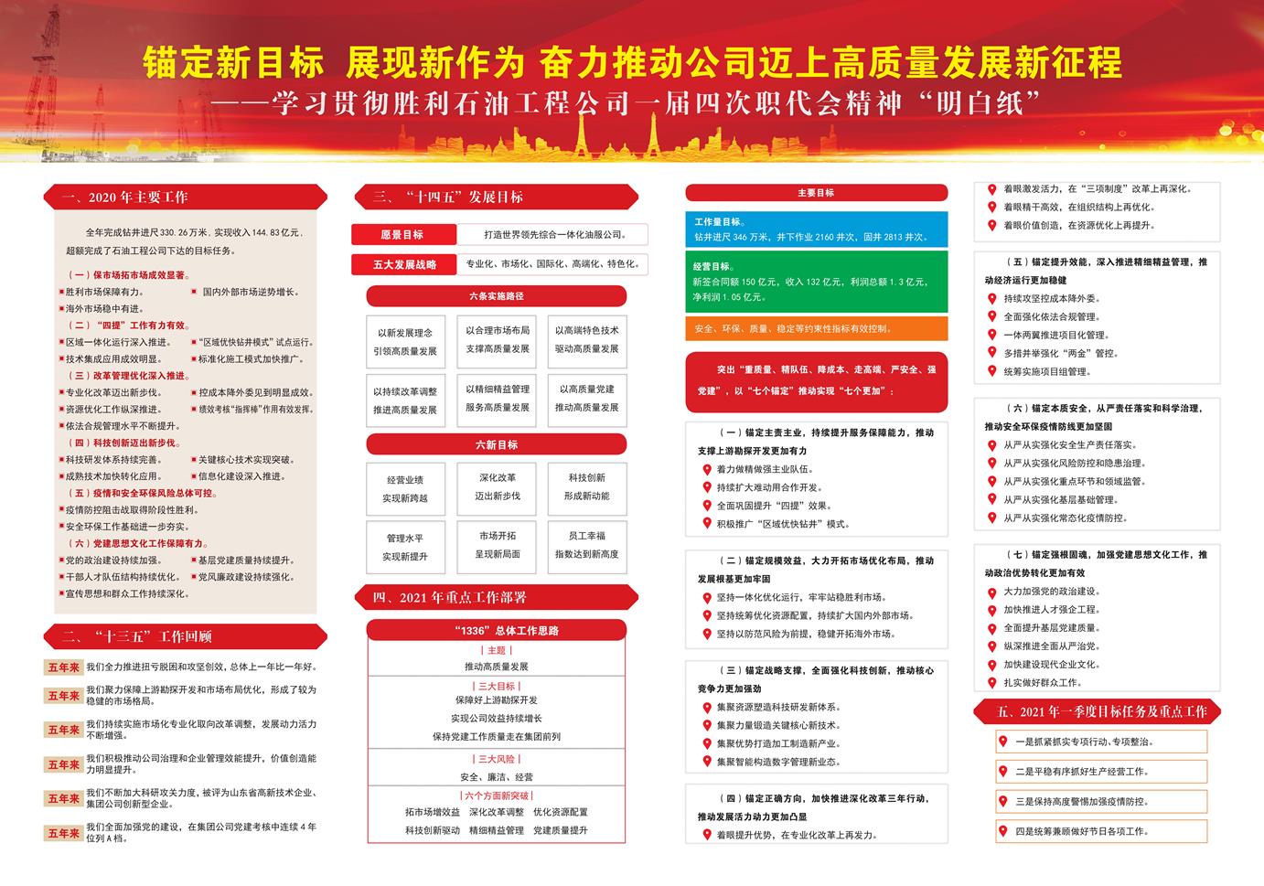 2021年1月22日,胜利石油工程公司党委扩大会、第一届职工代表大会第四次会议召开,胜利石油工程公司执行董事、党委书记、总经理孙永壮分别作了作题为《勇担使命 奋发进取 全力开创公司高质量发展新局面》、《锚定新目标 展现新作为 奋力推动公司迈上高质量发展新征程》的报告。 号召公司上下以习近平新时代中国特色社会主义思想为指导,深入贯彻落实新发展理念,心无旁骛,拼搏奉献,全方位推进高质量发展,为圆满完成2021年目标任务、实现“十四五”规划顺利开局不懈奋斗,以优异成绩庆祝建党100周年。