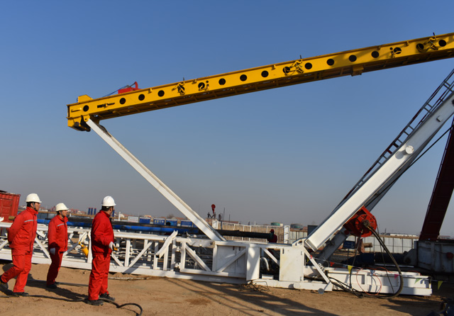 本设备是一种集成化的、智能动力猫道机,本发明可以同时运送及甩三根钻具,相比较原有的单根猫道机大大地提高了工作效率,减少场地工的数量,减轻工人劳动强度,同时提高了钻机系统的工作效率。由于采用液压控制,可以实现无级变速,简化了传动机构,提高了设备的适应性及可靠性。