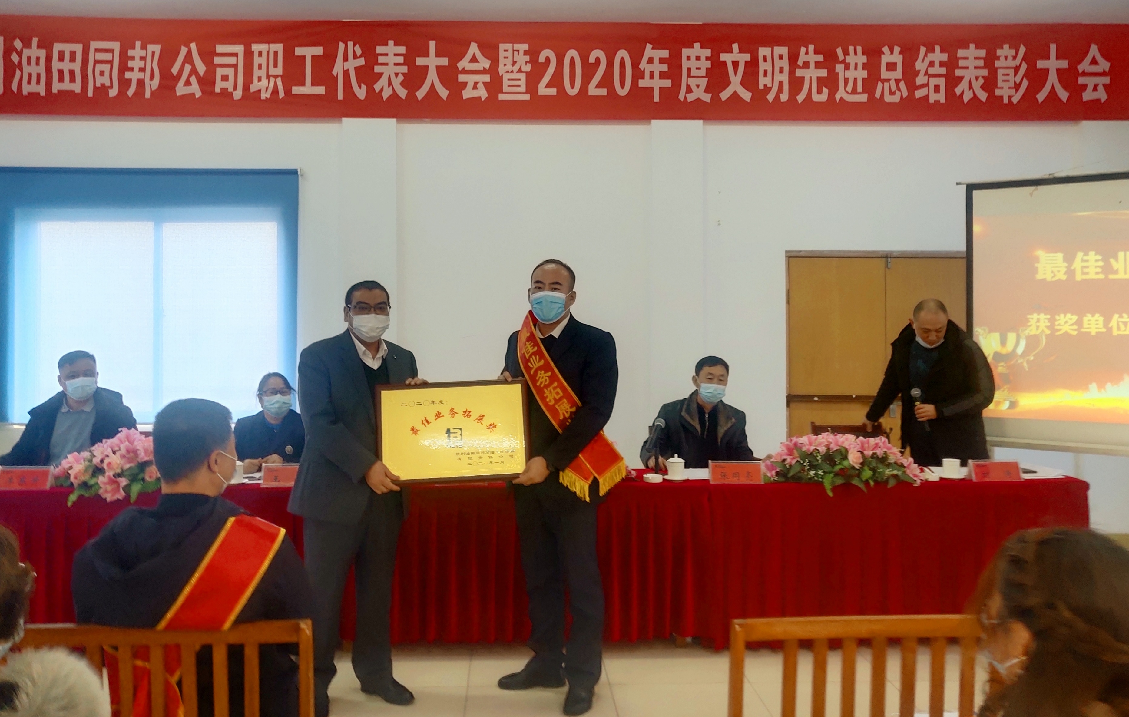 获得最佳业务拓展奖的北疆项目部、最佳效益奖的石油装备制修厂代表董彬、刘朋分别作了典型发言。没有播种,何来收获,没有辛苦,何来进步。面对艰巨的工作任务,圆满完成全年各项工作任务。荣誉既是鼓励,也是继续前行的动力,面对2021年,大家定会更加乘风破浪、坚毅前行,为公司持续发展贡献自己的全部热情和力量。