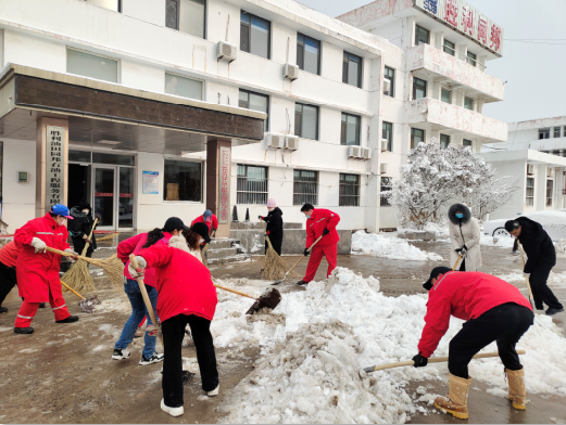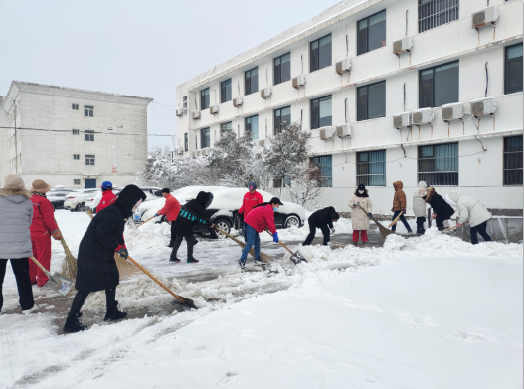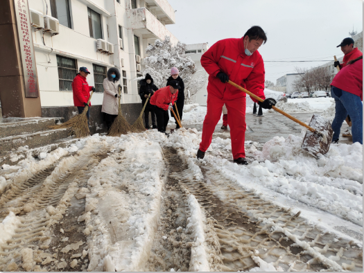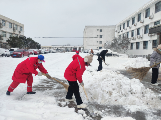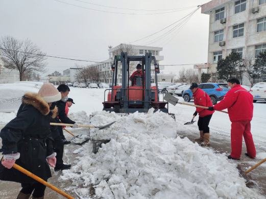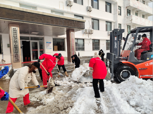 全体员工冒着飕飕袭来的寒风舞雪,纷纷拿起铁锹、扫帚等工具,同事们不畏严寒,积极主动、相互配合、齐心协力,挥舞着铁锹和笤帚,你铲我扫,一派热火朝天的景象,一点点地将积雪和冰层铲起集中堆放,尽管大家的脸都冻得通红通红,但手中的扫雪工具却不停地挥舞着,忙得浑身是汗,在欢声笑语中扫出了干净的办公区域和畅通的大道,热火朝天的扫雪场面为寒冷的冬季增添了另一种美丽。