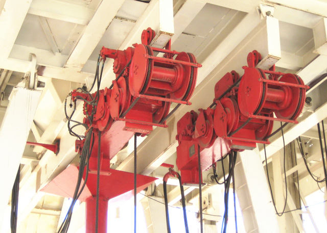 防喷器吊移装置是为满足用户安装、拆卸防喷器的需要而设计的,采用全液压控制,可用于大、中型钻井设备。其主要功能为:移动单个防喷器进行安装或移动组合好的防喷器组今次那个安装。该防喷器吊移装置具有防爆、操作简单、可靠、安全的特点。分别悬挂于钻台面下部两根导轨上的防喷移动装置,可通过液压操纵箱的控制,实现同步起升、下方、前移、后移的动作,以及分别起升、下方和有限粉底距离(最大分离距离≤1m)的前移、后移。这样大大方便了防喷器的安装和拆卸。