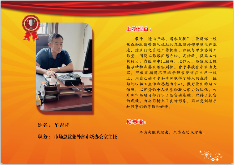 同邦公司银牌员工--市场总监兼外部市场办公室主任牟吉祥